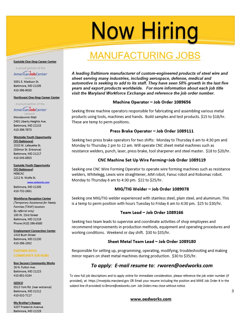 Baltimore Jobs Resources Moed On Twitter Now Hiring Manufacturing Jobs In Baltimore Machine Operator Sheet Metal Team Lead Team Lead Mig Tig Welder Cnc Machine Set Up